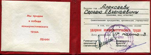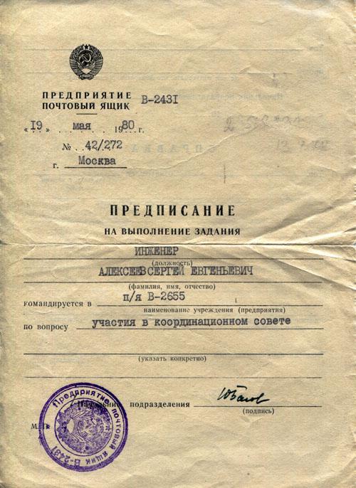 Мне выпала самая дальняя от метро «Сокол» проходная: «у троллейбусного парка», мой пропуск имел код Р-483 и означало это, что каждое утро с 8-15 утра (но не позднее 8-30) я должен был появиться в проходной у «пропускного пункта» с литерой «Р», набрать на большом сером металлическом пульте цифры «483», затем в полностью изолированной от внешнего мира, остеклённой кабинке у «контролёра» что-то щёлкало, долго вращалось и в лоток выпадал именно мой пропуск с фотографией (аналог современного «пластика» эпохи «развитого социализма») – бумажный прямоугольник с моей фотографией, именем-фамилией, зафиксированный «намертво» в прозрачном целлулоиде, окантованным металлической рамочкой. Следовало строевым шагом (ирония..) приблизиться к контролёру и «громко и отчётливо» (как на утренней перекличке в ГУЛАГе) произнести: «Алексеев Сергей Евгеньевич, пропуск Р-483» Контролёр бдительно сверял мой облик с фото на пропуске и принимал трудное решение: пустить или не пустить меня на вверенный ему «режимный объект». Если решение было положительным – контролёр передавал мне пропуск через окошко своей кабинки, я брал его (не снимая перчаток!) и бережно хранил до конца рабочего дня. Утеря пропуска делала невозможным выход с территории предприятия (со всеми вытекающими последствиями!)