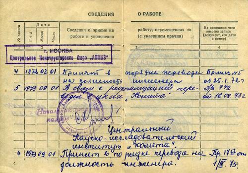 Утром - новые заботы: нужно было так рассчитать время, чтобы ДО 8-30 утра в потоке таких же как я «сотрудников» (на «Алмазе» в те годы трудились 21 000 человек!) успеть пройти через ту же самую дальнюю проходную «у троллейбусного парка» на территорию предприятия и не просто пройти (отстоять длинную очередь входящих, без запинки назвать «контролёру» номер своего пропуска - как сейчас помню: Р-483) но и миновать турникет, добежать от самой дальней проходной до главного корпуса предприятия, взобаться на второй этаж, успеть «задвинуть» маленький жестяной ярлычок (табель!) на «табельной доске»: чтобы суровая «табельщица» не записала прогул, добраться до своего рабочего места, успеть его занять, создав на столе «твоческий беспорядок» и встретить заведующего лабораторией широкой улыбкой - вот он я, уже на рабочем месте, готов к труду на благо Родины любимой!